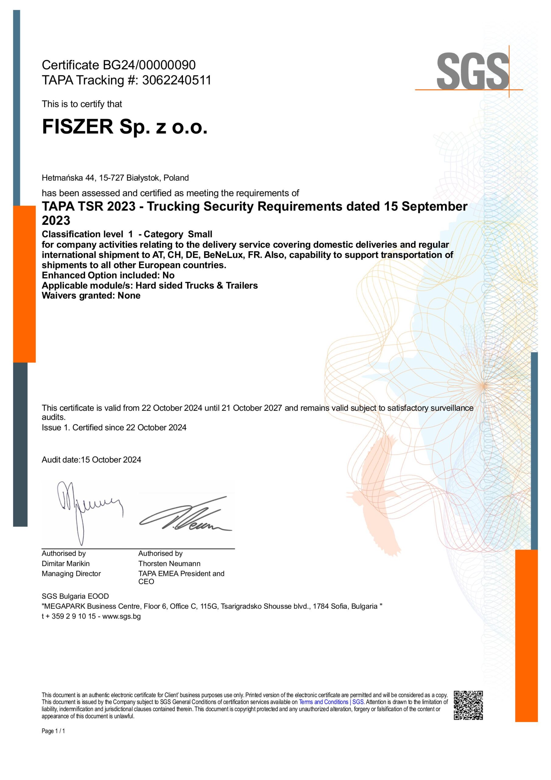 Certyfikat TAPA TSR Level 1